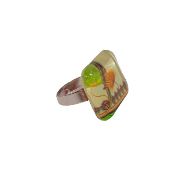 Un anillo con un estampado detallado de Cotorro que combina tradición y modernidad. Su diseño multicolor resalta con elegancia, convirtiéndose en el complemento perfecto para quienes buscan un accesorio audaz y lleno de simbolismo.