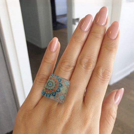 Un anillo con un estampado detallado de Mandala Turquesa que combina tradición y modernidad. Su diseño multicolor resalta con elegancia, convirtiéndose en el complemento perfecto para quienes buscan un accesorio audaz y lleno de simbolismo.